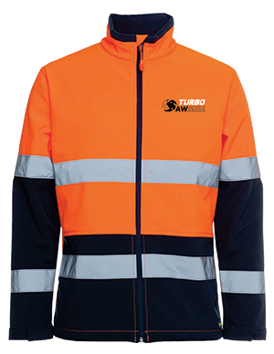 High-quality hi-vis soft shell jacket custom-produced in Australia and branded with the Turbosawmill logo.
